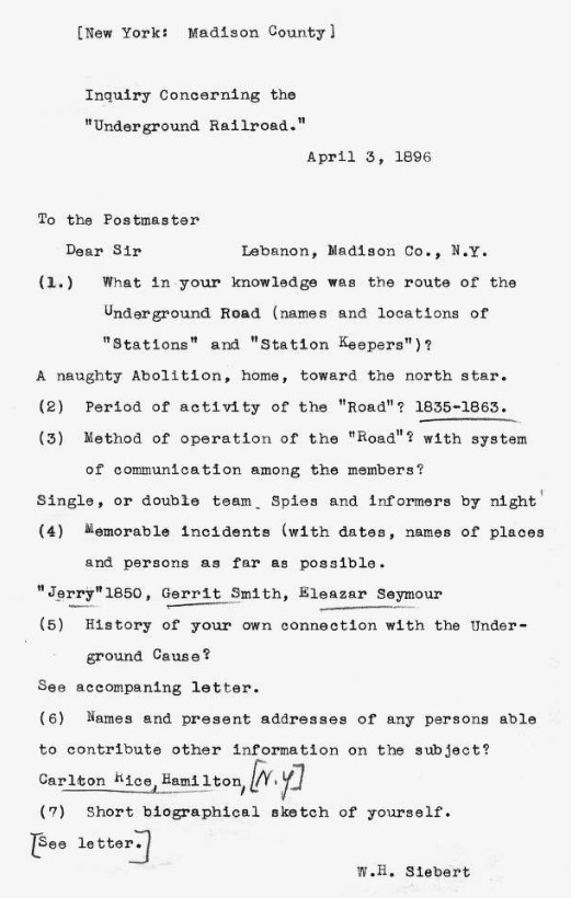 Professor Siebert’s research included solicitations of people and institutions for information on the UGRR. Below is an solicitation he sent to the Postmaster of Madison County, New York, between Syracuse and Utica.