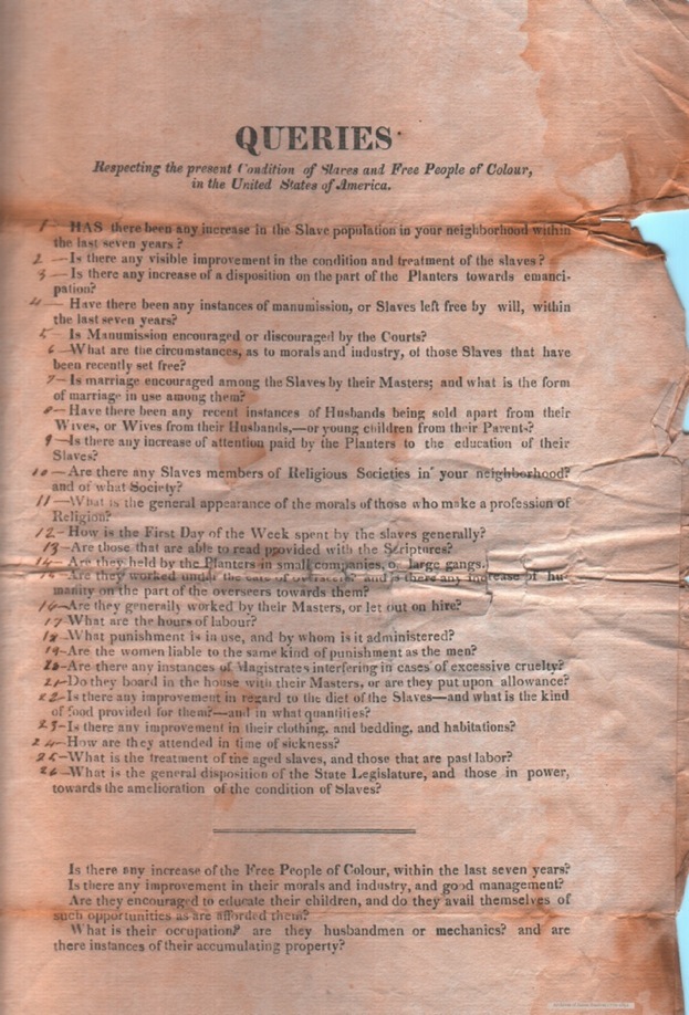 James Stanton (CatherineAnn’s father) left us an interesting item from his extensive abolition work, this pre-dating his move to Springborough, “Queries Respecting the present Condition of Slaves and Free People of Color in the United States of America.” The answers provided by James Stanton (c. 1820) are a compelling way to understand the times and this family, which continued to strive for abolition, women’s suffrage and temperance for another century. James Stanton (1779-1862), through his Journal, a recollection of his abolitionist activities, is well-known for his work in freeing people from slavery in his native state of Virginia.